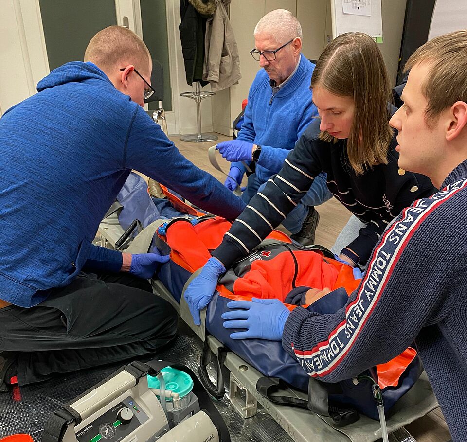 Am Dienstag stand für unsere Helferinnen und Helfer das Thema "Rettung & Immobilisation" auf dem Dienstplan. Dabei ging es nach einem kurzen theoretischen Teil auch an die Praxis. Dabei festigten wir nochmal den Umgang mit den entsprechenden Hilfsmitteln wie der Schaufeltrage und der Vakuummatratze.